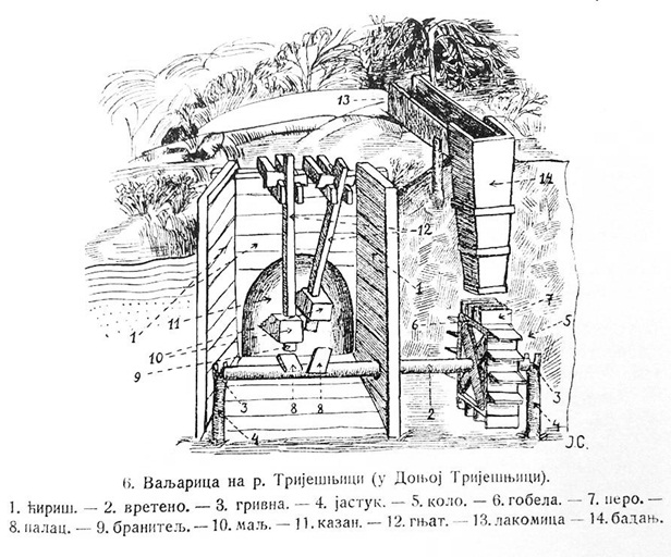 (4959) voĭală (rom. dârstă) valjavica [imenica]voĭală (mn. voĭaļe) [akc. voĭală] (i. ž.) — valjavica, valjarica; stupa ∎ iśa, linga moară, ń-a fuost voĭala, ama kînd s-ă lăsat muĭeriļi să țîasă la śuariś, voĭala s-a părasît — ovde, pored vodenice, bila nam je valjavica, ali kad su žene prestale da tkaju sukno, ona je zapustela [Zvizd] ♦ dij. var. vaĭală ∎ la vaĭală sa-nvaļesk śuariśi dupa țasut, să fiĭe măĭ gruoș șî măĭ đeș — na valjavici valja se sukno posle tkanja, da bude deblje i gušće (Tanda) [Por.] Etimologija: srb. valjalica Grupa reči: Zanati, alati, tehnika, oružje, mere, brojevi, poslovi, aktivnosti [=514 pojma] Reč zapisao: Durlić Mesto: Bukovska Opština: Kučevo Područje: 09 Ungurjani (Pečani) IZ RUMUNSKIH REČNIKA: www.dexonline.ro I DRUGE NAUČNE LITERATURE dârstă sf [At: (a. 1441) IORGA, S. D. V, 197 / V: (înv) dâr~, der~, (reg) ~să, drâs~ / Pl: ~te / E: cf: bg дръстя] 1 - 2 (Îrg) Piuă rudimentară acționată de o apă curgătoare, în care se bat dimia, postavul etc. (de către vâltoarea apei sau) cu ajutorul unor ciocane de lemn Si: vâltoare. 3 (Olt; îe) A da pe cineva la ~ A pune pe cineva la muncă. 4 (Îae) A observa atent activitatea cuiva. 5 (Îe) A se da la ~ A se obișnui cu munca grea. 6 (Mol) Loc bătătorit. Sursa: MDA2 (2010) Link : dârstă | |