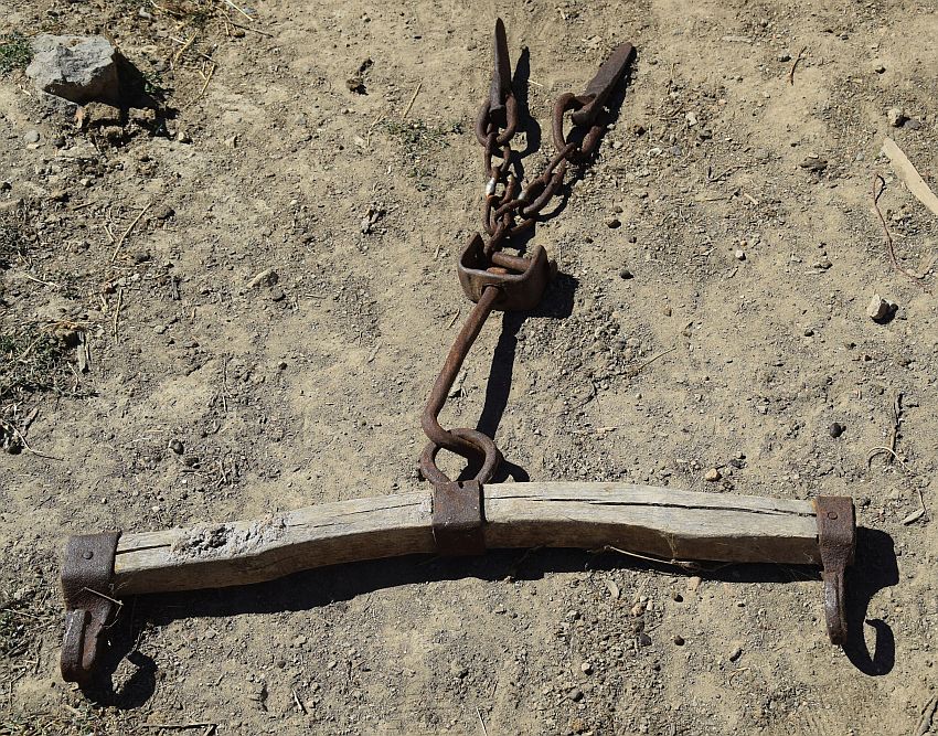 ![]() Klikni na sliku za povećanje! Click to image for big foto! | Kobilka đe tras la trușă, ku kîrļig, lanț șî doă pĭańe. — Vagir za izvlačenje trupaca, sa kukom, lancem i dva klina, snimio Paun Es Durlić u kući g. Žujice u Leskovu u opštini Majdanpek (13.08.2019). |