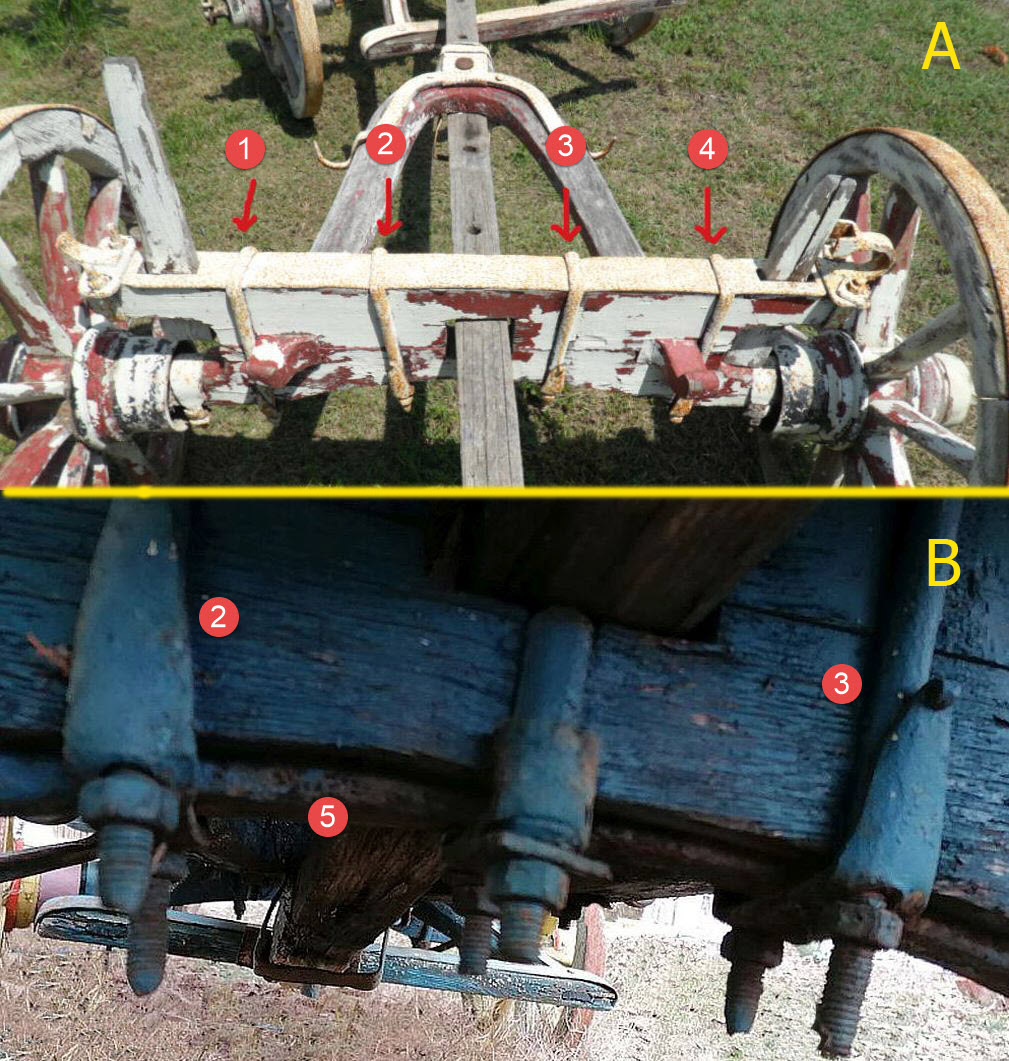 ![]() Klikni na sliku za povećanje! Click to image for big foto! | Țugurĭ la karu đi buoĭ, însamnaț ku arkuļeță ruoșîĭe, no. 1-4 . La karo-sta đi pi sļikă ĭastă uopt țugurĭ, kî ći patru la tuata uosîĭa. Pi sļika đižuos sa vĭađe kum sînt inkiptoraće ţugurļi (2, 4), şi kum ļagă uosiĭa karuluĭ, 5— Cugovi na zaprežnim kolima, označeni crvenim strelicama. Na ovim kolima ih ima osam, po četiri na svakoj osovini, br. 1-4 na zadnjem trapu. Na donjoj slici (B) vidi se kako su cugovi pričvršćeni i kako vezuju osovinu zadnjeg trapa (5). Snimio: Bojan Balić, specijalno za Vorbar. (Blizna, zas. Rudne Glave, opšt. Majdanpek, 19. V 2012.) |