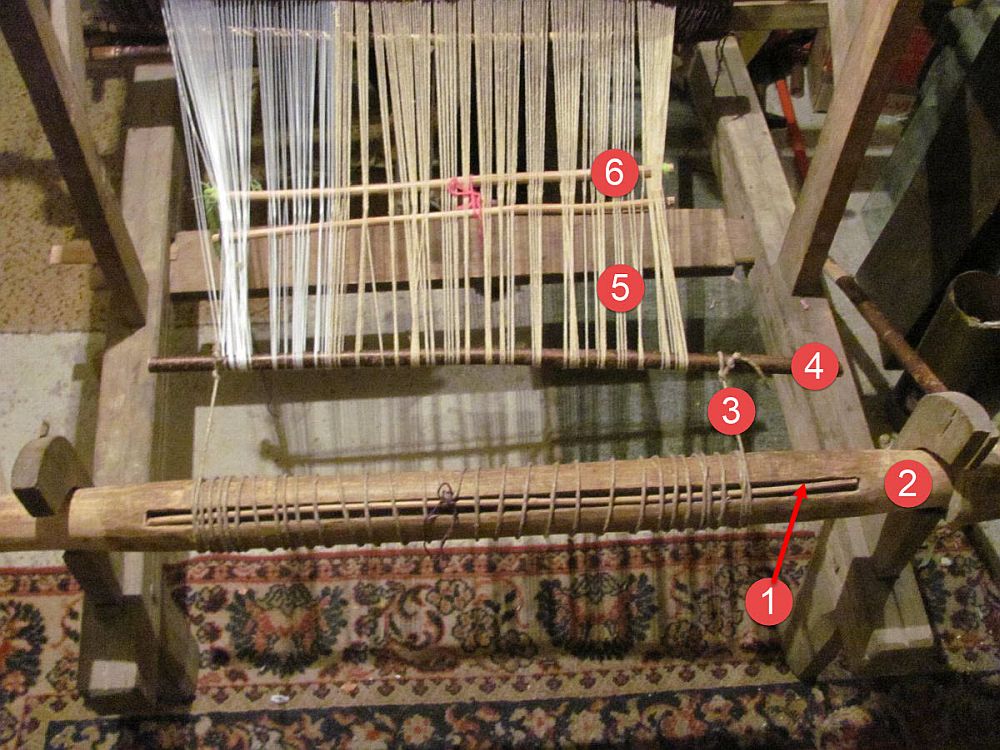 ![]() Klikni na sliku za povećanje! Click to image for big foto! | 1) verźaua, bagată iń žgĭabu sululuĭ 2) sulu al đinapuoĭ 3) aţa învăluită pi sul şî ļegată đi prinḑaturĭ śe ţîńe kîpatîńu urḑăļi, (starĭa la gaćitu ţasutuluĭ) 4) prinḑatuorĭu învîrat în urḑală, şî ļegat ku aţă gruasă đi sul 5) urḑala ţasutuluĭ 6) fuśiĭļi, kare kînd sa skimbă iţîļi, fak ruost la urḑală, đi sî sa puată traźa sovĭaĭka ku baćala. — 1) uzlenjača, uglavljena u žljeb vratila 2) zadnje vratilo 3) konac obmotan oko vratila i vezan za držač, uvučen u kraj osnove, (položaj pri završetku tkanja) 4) držač uvučen u osnovu, i vezan debelim koncem za vratilo 5) osnova tkanja 6) nitnjače, koje pri promeni nićanica prave zev na osnovi da bi mogao da se provuče čunak sa potkom, foto: Durlić, u Majdanpeku, u stanu tkalje Jele Makulović, 2013. godine. |